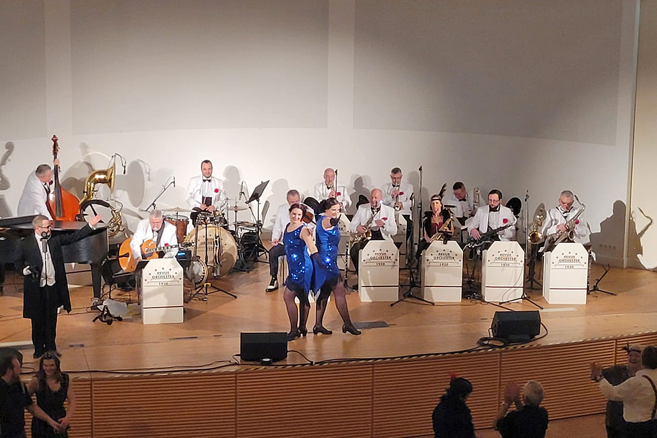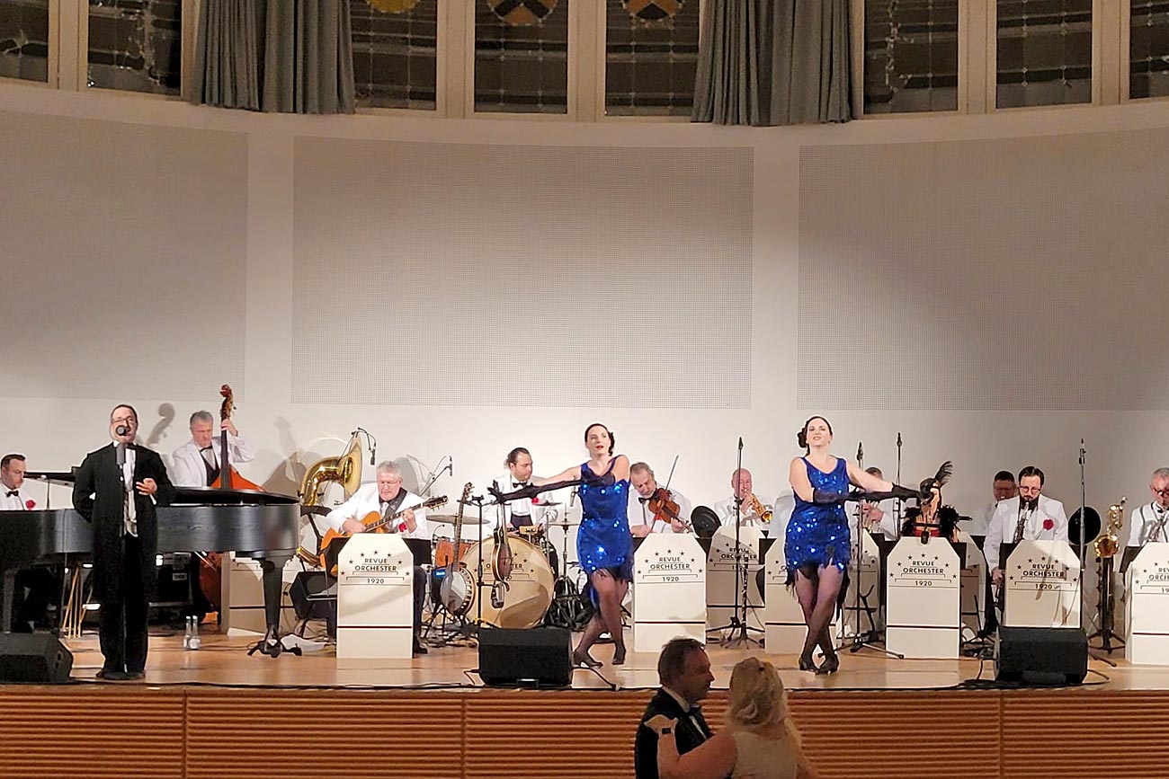 Das Revue Orchester 1920 bietet einen exklusiven Konzertabend mit hinreißender Musik aus den Metropolen der 1920er, 30er und 40er Jahre. Von den quirligen Tanzpalästen Berlins geht es in die funkelnden Pariser Revuetheater, um sich dann musikalisch in einem verruchten New Yorker Jazzkeller wiederzufinden. Vom Charleston bis zum Swing, vom Tango über Walzer bis zum Step.
